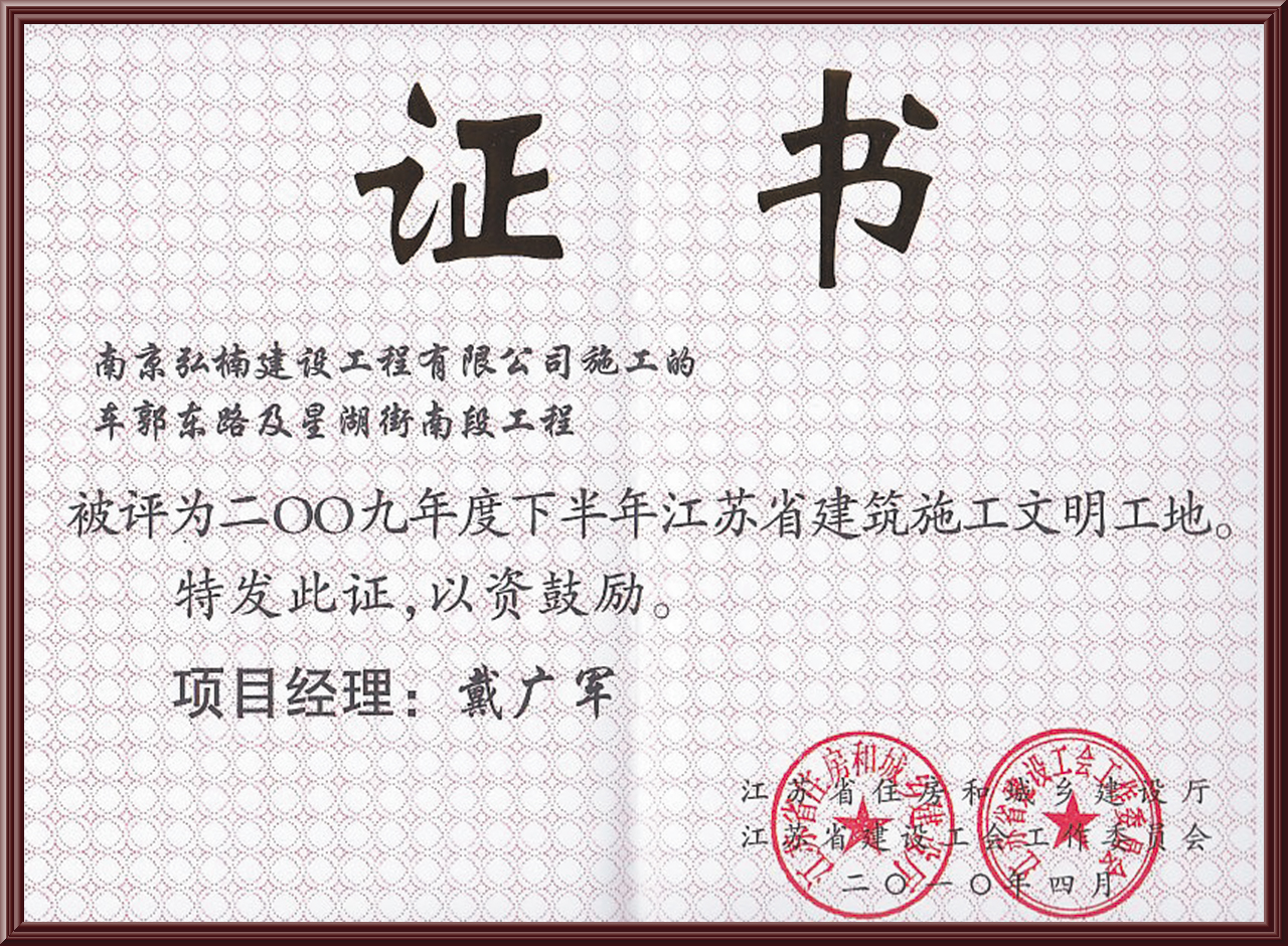 公司承建的車郭東路與星湖街南段工程被評為“二〇〇九年度江蘇省建設(shè)施工文明工地”